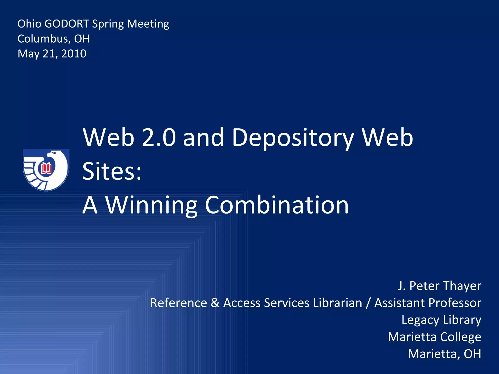 The document discusses how a government depository library incorporated various Web 2.0 tools and services into its website to enhance user experience and promote resources. These included Meebo chat, AddThis sharing buttons, Google custom search, Delicious social bookmarking, and RSS feed conversion. Using these tools decreased pages while increasing external links. Future initiatives may include using Facebook, Twitter, and Yahoo Pipes for additional promotion and content aggregation. Implementation of some tools like Pipes presents challenges around technical skills and source compatibility.