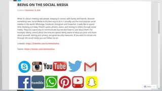 This document provides information on various technology, business/financial, and entertainment blogs as well as web-based collaboration tools. It summarizes different blogs focused on topics like life hacks, design, gadgets, social media, small business, finance, music, and humor. It also describes tools for cloud storage and file sharing like Google Drive and Dropbox as well as professional networking platforms like LinkedIn and uses for blogs to boost one's digital presence. The document includes links to the author's LinkedIn profile and personal blog.