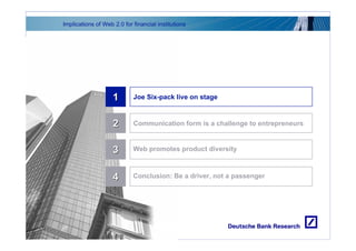 The document discusses the implications of Web 2.0 for financial institutions. It notes that Web 2.0 has driven technology changes like broadband and convergence, as well as societal changes like increased communication and individuality. Web 2.0 also challenges companies to communicate authentically with customers online. New applications like lending platforms and payment systems are developing, increasing product diversity but also competition. The conclusion states that Web 2.0 brings both opportunities and challenges for financial institutions, and that companies should seek to drive changes rather than just react to them.