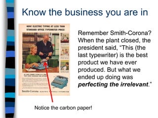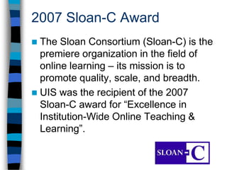 The document discusses how online education is transforming colleges and universities in the United States. It begins by cautioning institutions not to "perfect the irrelevant" and to know what business they are in. It then provides statistics on internet and social media usage to illustrate how ready society is for online learning. Several studies are cited showing online and blended students perform equal or better than face-to-face students. Examples are then given of several universities that have experienced growth and strategic benefits from online education, including increased access, flexibility, and revenues. The document advocates for a focus on quality using a collaborative consortium approach.