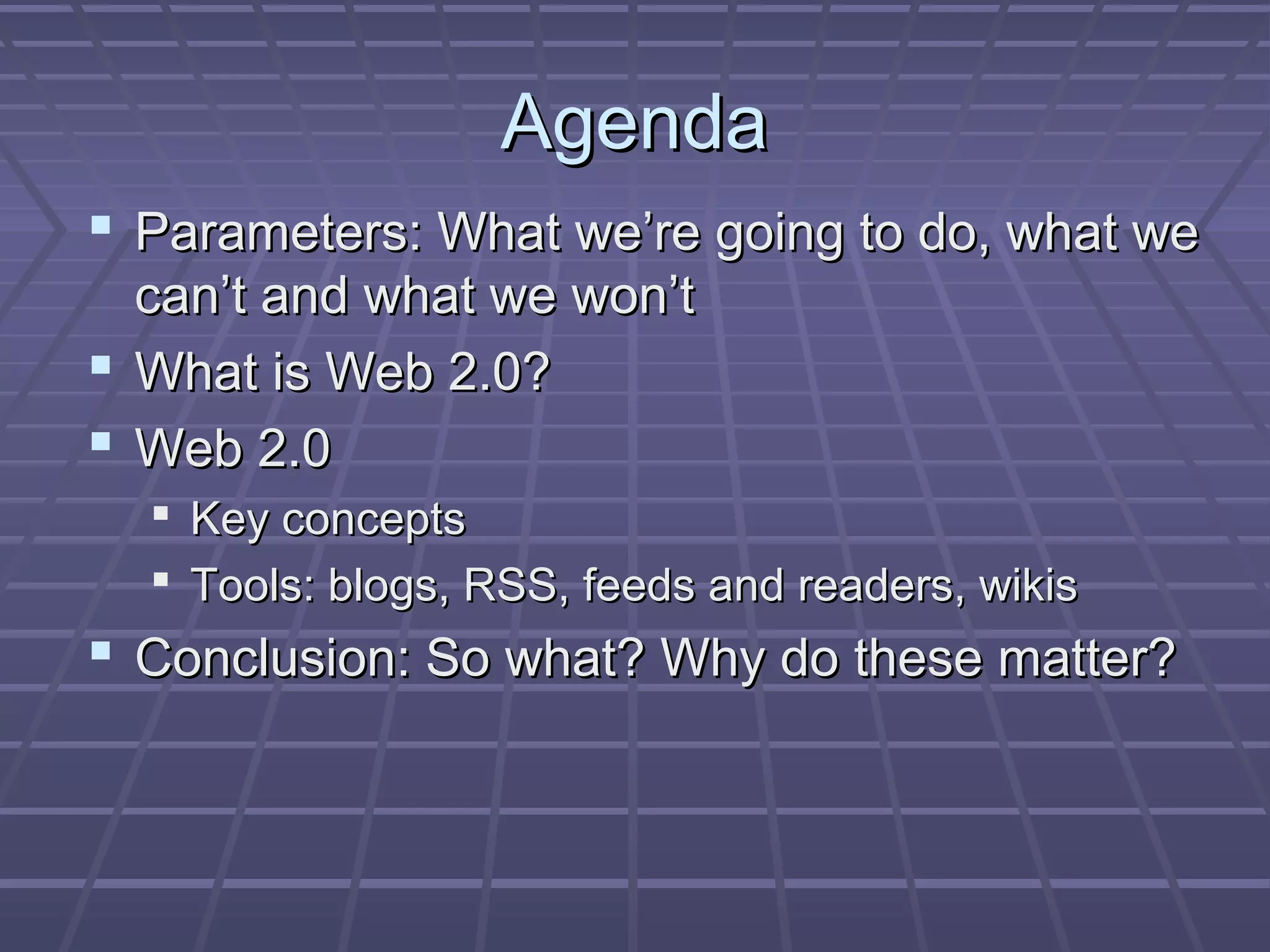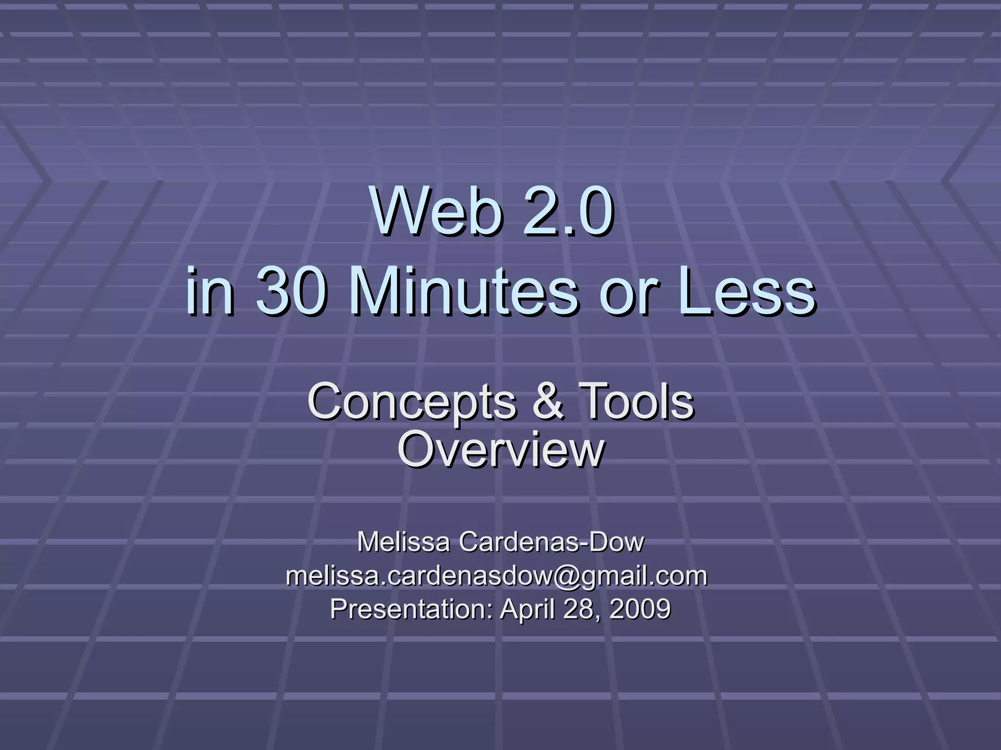 This document provides an overview of key concepts and tools related to Web 2.0 in 30 minutes or less. It defines Web 2.0 as focusing on user collaboration, contribution and community through tools like blogs, wikis, RSS feeds, social bookmarking and networking sites. Some key concepts discussed include individual production and user-generated content, harnessing the power of the crowd through collective intelligence, the architecture of participation through open platforms, and network effects like power laws and the long tail. The document concludes by considering the implications of these changes and encouraging participants to explore and engage with Web 2.0.