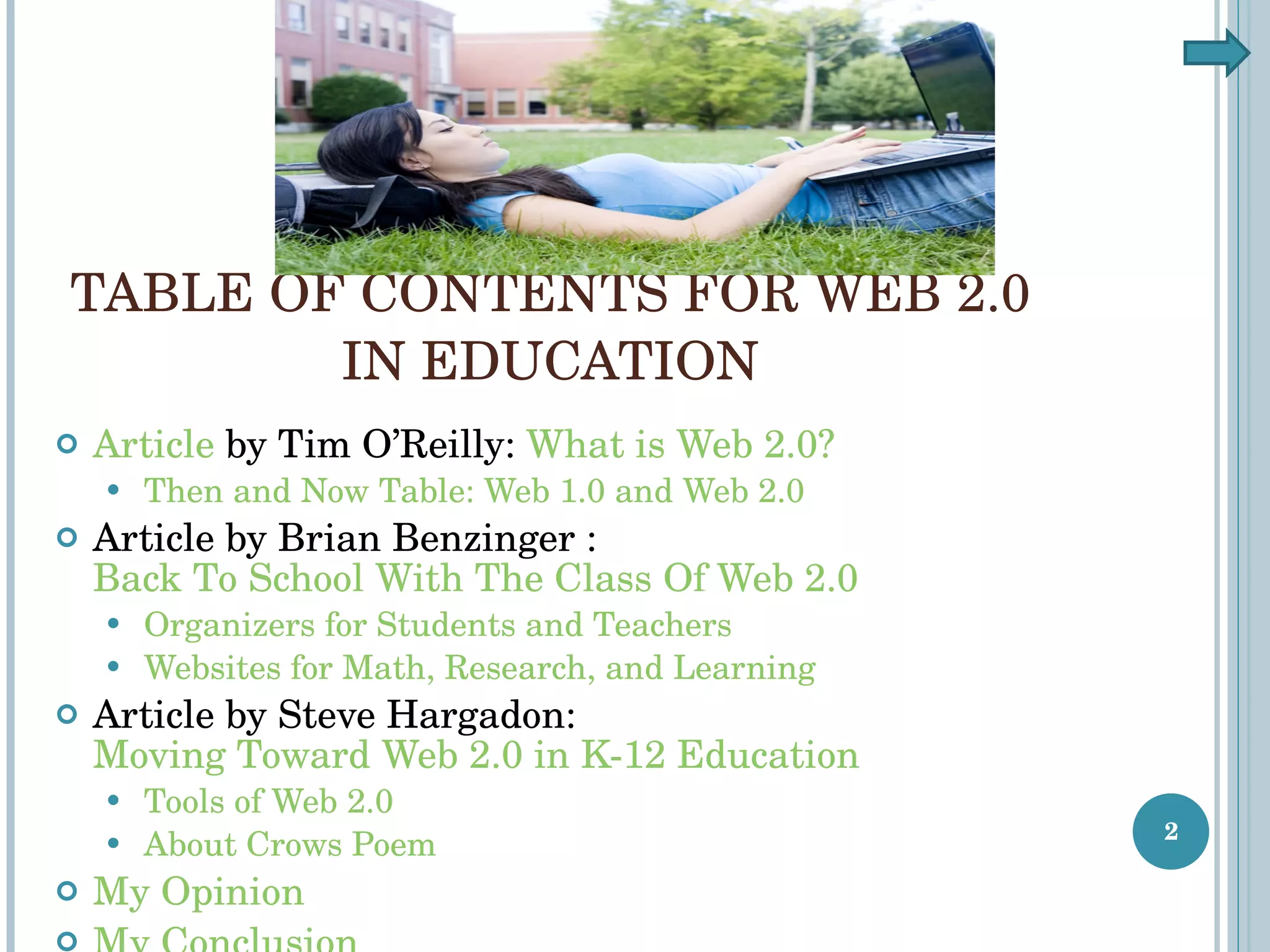 This document discusses the evolution of the internet from Web 1.0 to Web 2.0 and tools available for education through Web 2.0. It provides definitions of Web 1.0 and Web 2.0, examples of how they differ, and lists various online tools and websites for organizing, math, research, and learning that teachers and students can use. It also summarizes articles about moving education toward Web 2.0 and the benefits this can provide like engagement, creativity, collaboration and critical thinking.