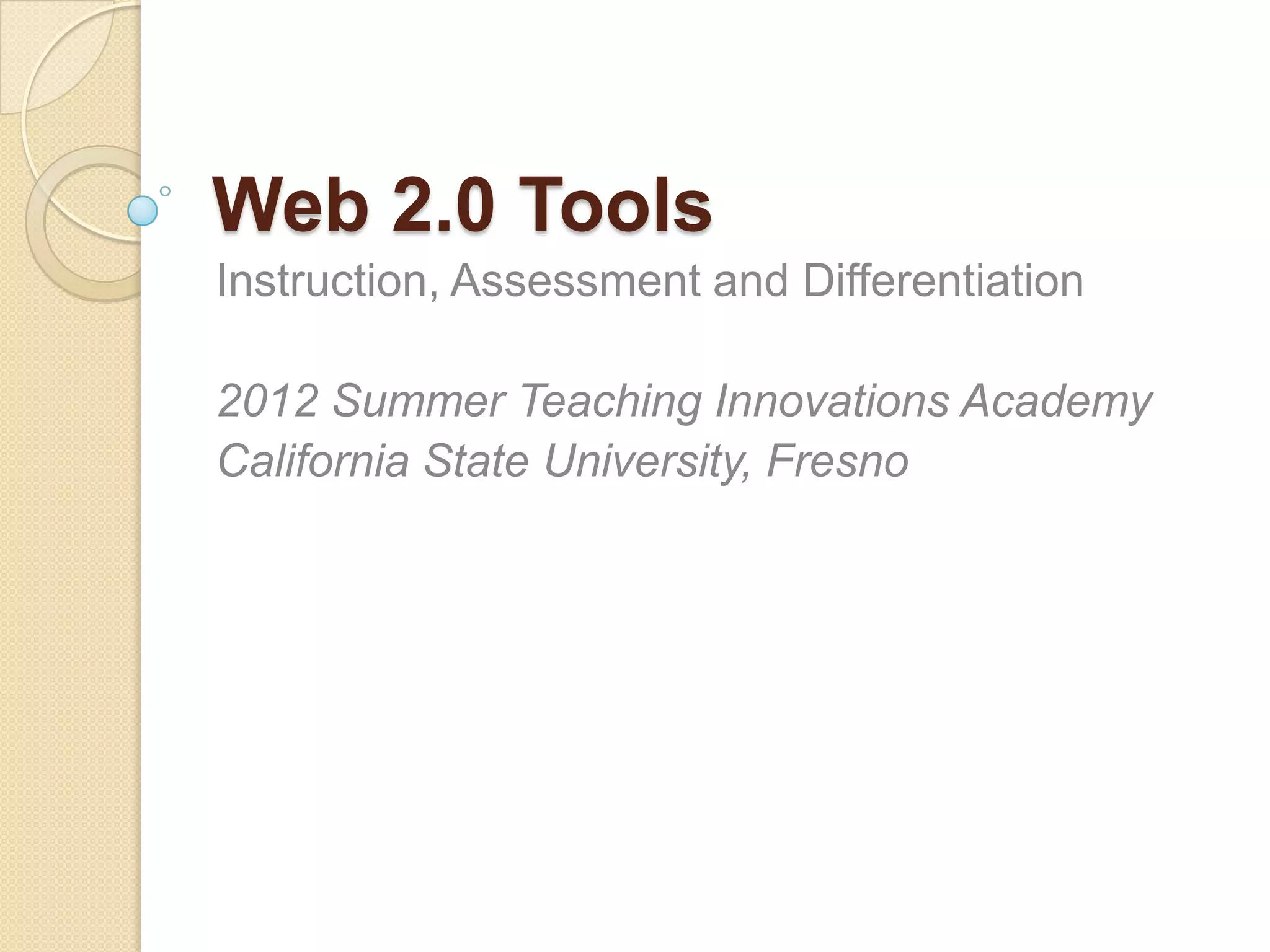 This document discusses ways to differentiate instruction and assessment using Web 2.0 tools. It outlines universal design principles that provide flexibility and meet diverse learner needs. It also describes multiple intelligences and strategies for each, along with technology tools to support different learning styles, including verbal-linguistic, logical-mathematical, visual-spatial, musical-rhythmic, intrapersonal, bodily-kinesthetic, interpersonal, and naturalist intelligences. Specific Web 2.0 tools are suggested for differentiating instruction across content, process and product.