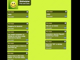 This document provides an overview of a presentation by three educators on using Web 2.0 tools in elementary classrooms. The presentation introduces several collaborative online tools for students including Wall Wisher for posting sticky notes, wikis for group writing projects, VoiceThread for multimedia discussions, word clouds with Wordle and ABC Ya, Animoto for video creation, and Voki for recording audio messages. Pros and cons are discussed for each tool.