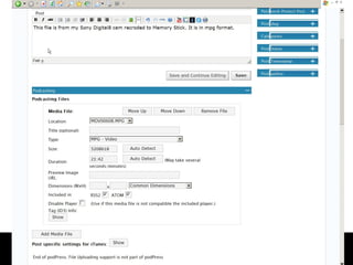 The document discusses various tools and techniques for creating, sharing, and playing back audio and video media over a network using web technologies. It provides an overview of podcasting, vidcasting, and photocasting sites and tools. It also discusses codecs, wrappers, UPnP servers and clients for streaming multimedia content between devices on a home network. A demo is given of using the TVersity UPnP server and D-Link DSM-320 UPnP client to stream media.
