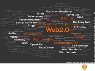 The document discusses various concepts related to Web 2.0 including social media platforms, folksonomy/tagging, syndication, mashups, and collaborative software. It describes tools like blogs, forums, wikis, social networks, bookmarking, instant messaging, and e-commerce sites that enable user participation, collaboration, and sharing of information and content online. The rise of these Web 2.0 technologies and applications provides the infrastructure for more open innovation and new ways of working together.