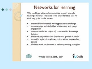 The document outlines a Web 2.0 professional development program focused on self-discovery through online learning. It describes the program's structure, participation requirements, interactions, and the use of various digital tools for effective learning. Additionally, it discusses the evolution of professional development and technology utilization in personal and vocational contexts.