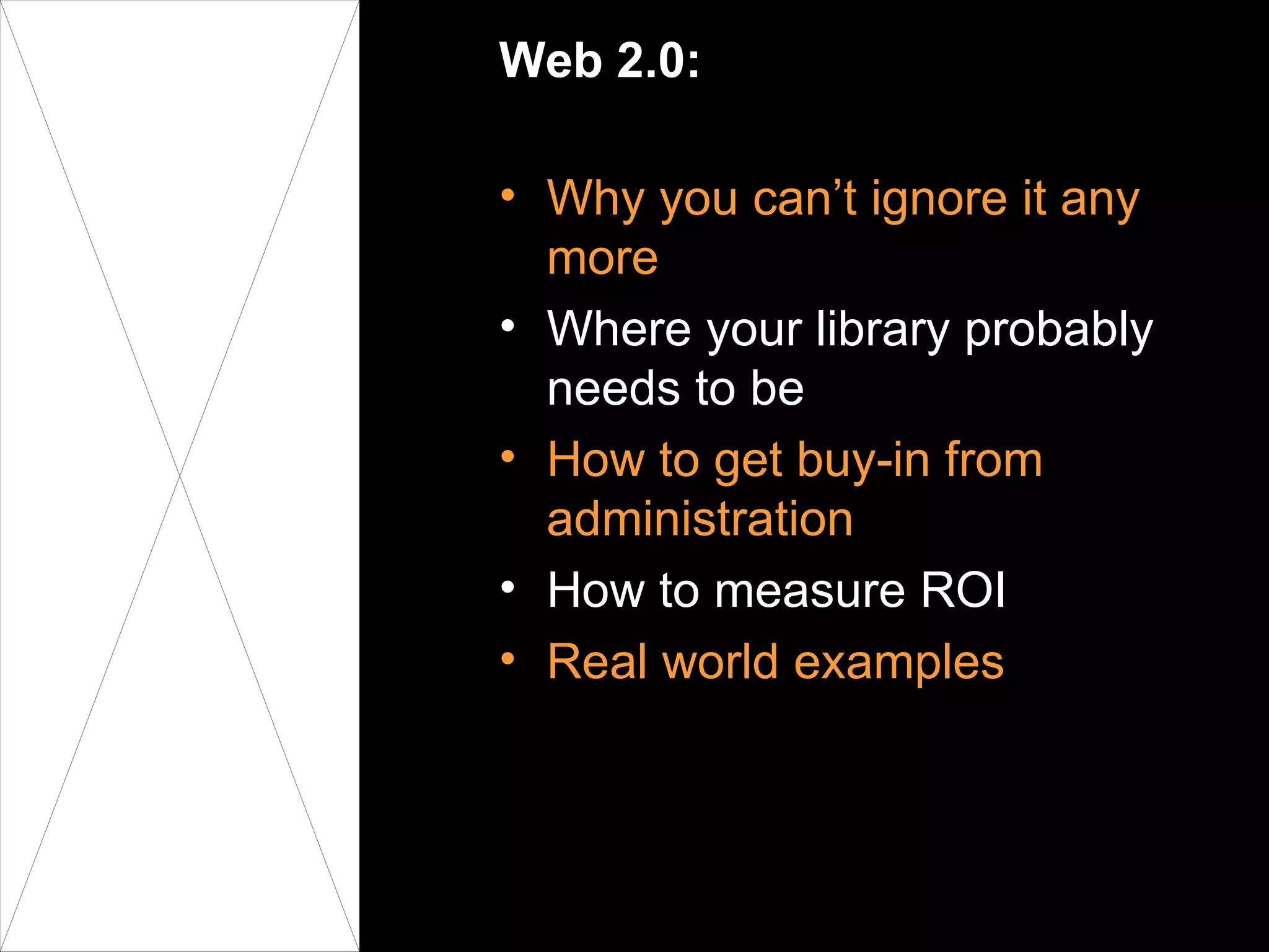 The document discusses the importance of Web 2.0 and social media for libraries, emphasizing that patrons expect libraries to engage with them through social platforms. It provides insights on how to obtain administrative support, measure return on investment (ROI), and navigate the potential pitfalls of social media use. Real-world examples and strategies for successful implementation are also presented.