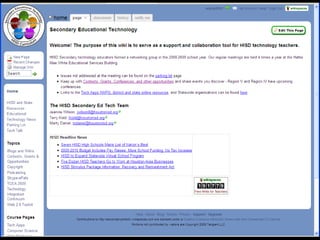The document provides information about various web 2.0 tools that can be used in secondary education, including wikis, Google Docs, and blogging platforms. It discusses how to create and use accounts on wikispaces.com and Google Docs. Examples of using Google Docs include creating class newsletters, calendars, project guidelines, and online forms and quizzes. The document also provides information on using blogging platforms like Blogger, WordPress, and 21Classes in the classroom, and discusses setting up wikis and online forums through Ning.