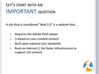 This presentation introduces 7 easy to use web 2.0 tools for teachers: GoAnimate for digital storytelling, Prezi as a PowerPoint alternative, WallWisher for discussion walls, Weebly for creating websites, Vuvox for timelines, ScribbleMaps for annotating maps, and Wordle for vocabulary building. Each tool is demonstrated and the pros and cons discussed. The presentation encourages teachers to try integrating one of the tools into their lessons that day. It also provides contact information for the presenter who offers training and curriculum development services.