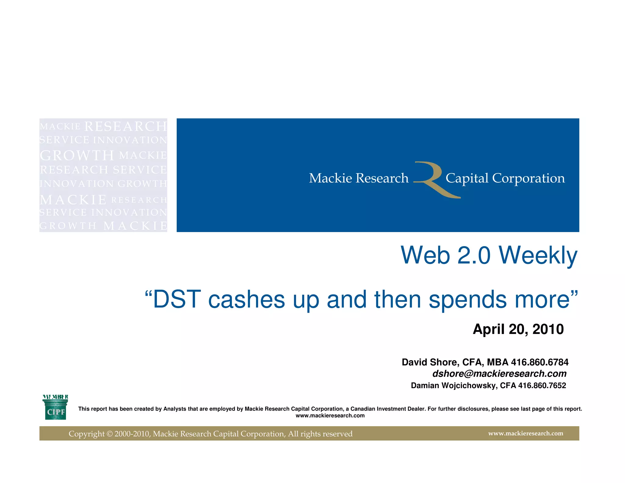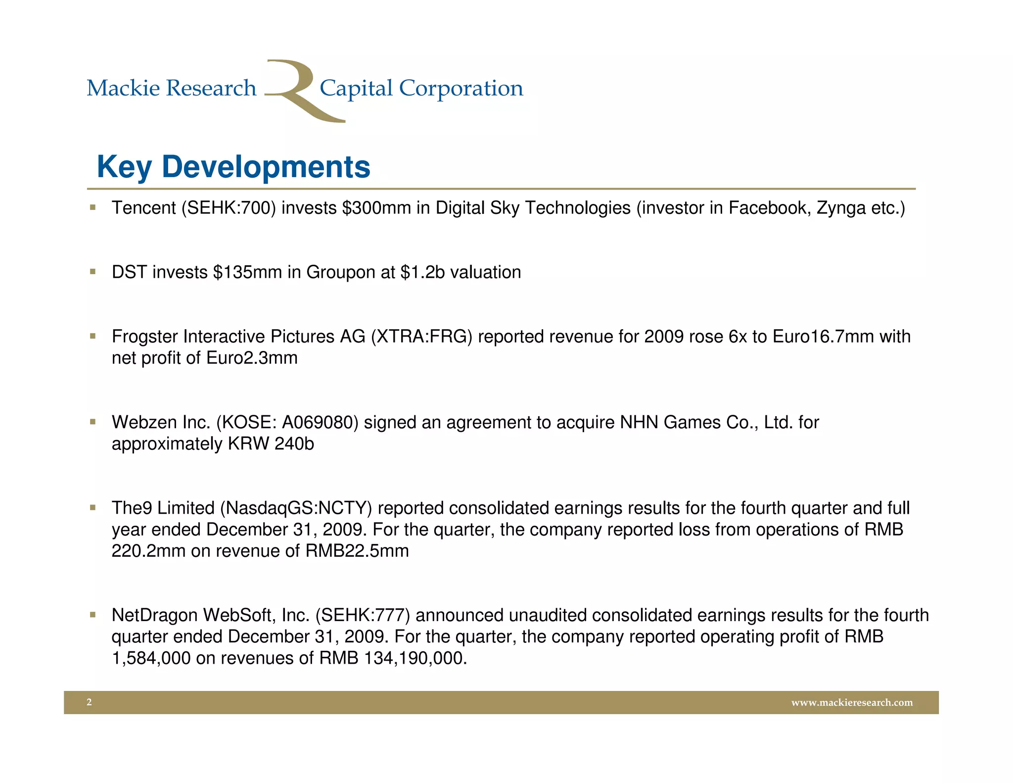The report discusses recent investments and performance metrics in the digital technology sector, highlighting Tencent's $300 million investment in Digital Sky Technologies and DST's $135 million investment in Groupon. It provides financial results for multiple companies, indicating varied revenue growth and profitability in 2009, along with detailed public company data including market capitalization and revenue. Additionally, the valuation metrics for web 2.0 public companies are presented, showcasing trends in market performance.
