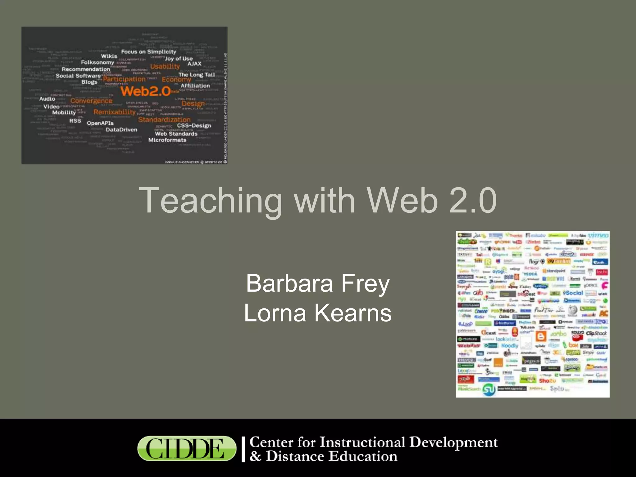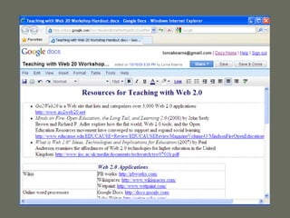 This document discusses using Web 2.0 technologies for teaching. It defines Web 2.0 as enabling greater social and participatory use of the web. It then categorizes common Web 2.0 applications such as wikis, blogs, bookmarking, multimedia sharing, and conferencing tools. For each category, examples of educational uses are provided, such as using wikis for collaborative projects or blogs for reflective journals. The document recommends considering how applications support learning goals, experimenting with short assignments, and evaluating effectiveness. Web 2.0 can provide many collaborative tools to engage students and extend traditional course management systems.