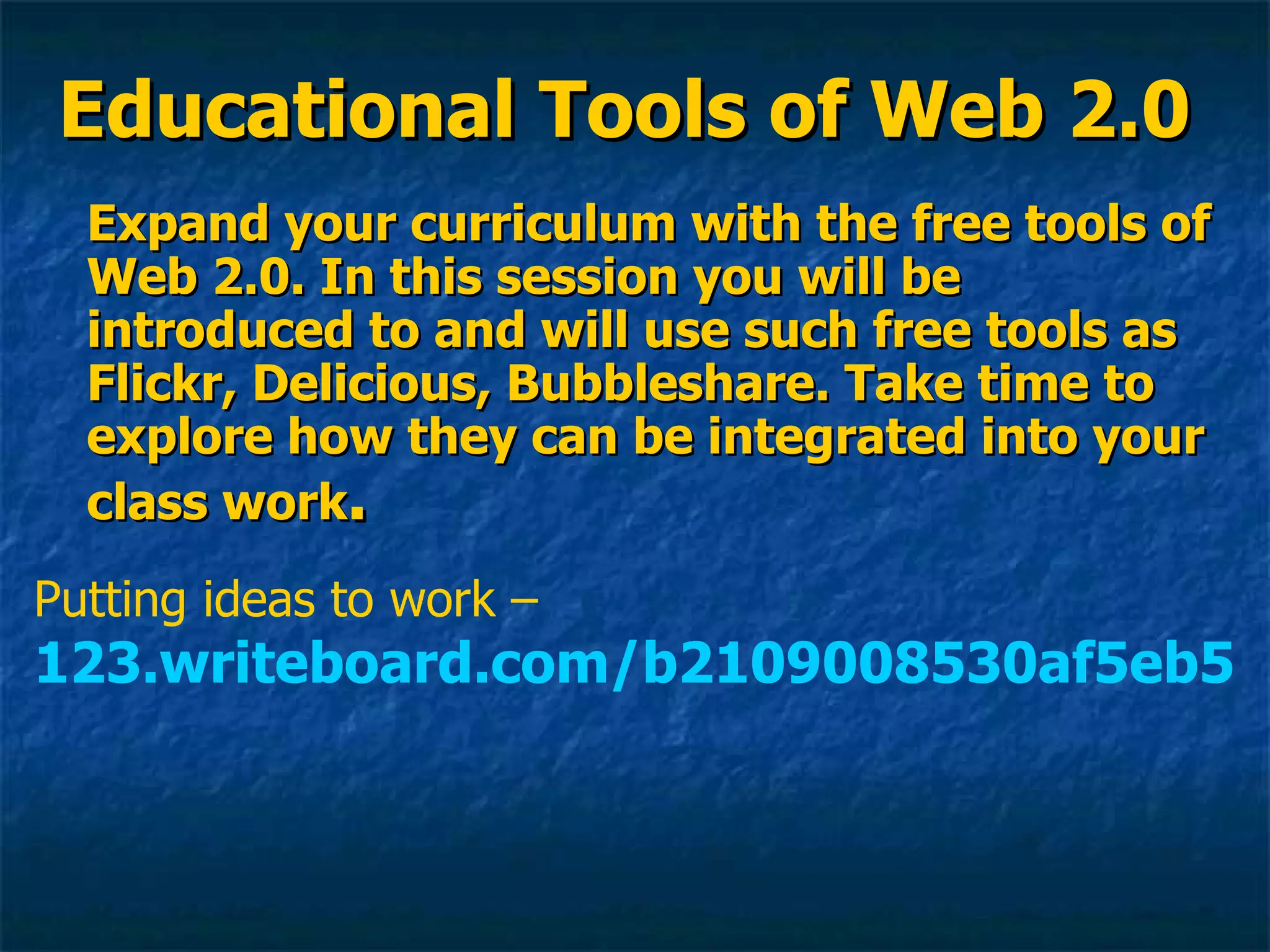 Educational tools of Web 2.0 like Flickr, Delicious, and Bubbleshare can expand curriculum by supporting a new collaborative learning environment. Web 2.0 represents a shift from static to social web where users can create and share knowledge. Common Web 2.0 tools for classrooms include social bookmarking sites to share research bookmarks, photo sharing sites to post presentations, and wikis or blogs for collaborative document writing and discussion.