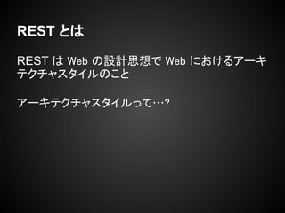REST という思想について 参考文献: 山本陽平『Webを支える技術』(技術評論社 (2010/4/8)) http://www.amazon.co.jp/dp/4774142042