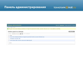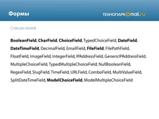 This document shows how to create forms and views for a blog application using Django. It demonstrates how to create model forms, display forms, validate and process form submissions, create class-based views for listing and detail pages, add pagination, and register the models with the admin interface. Generic class-based views like ListView and DetailView are used to reduce code duplication.
