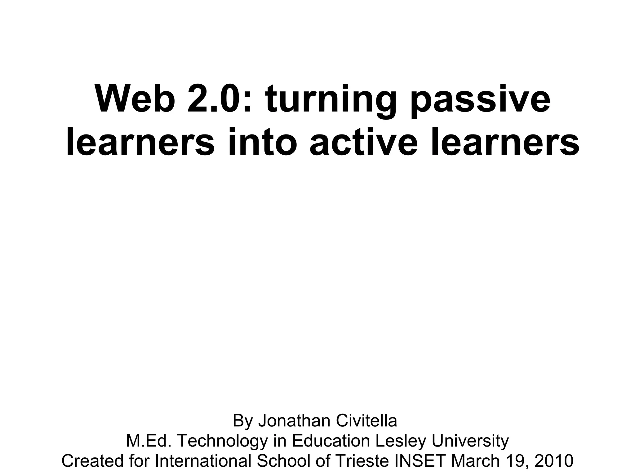 This document discusses how Web 2.0 technologies can transform passive learners into active learners by encouraging collaboration, accessibility, and student engagement. It provides examples of how tools like wikis, podcasts, and online assessments can be used to improve learning outcomes by making content more interactive and personalized for students. The document also acknowledges some potential drawbacks of technology in education, but argues that when used properly Web 2.0 has mostly positive impacts on learning.