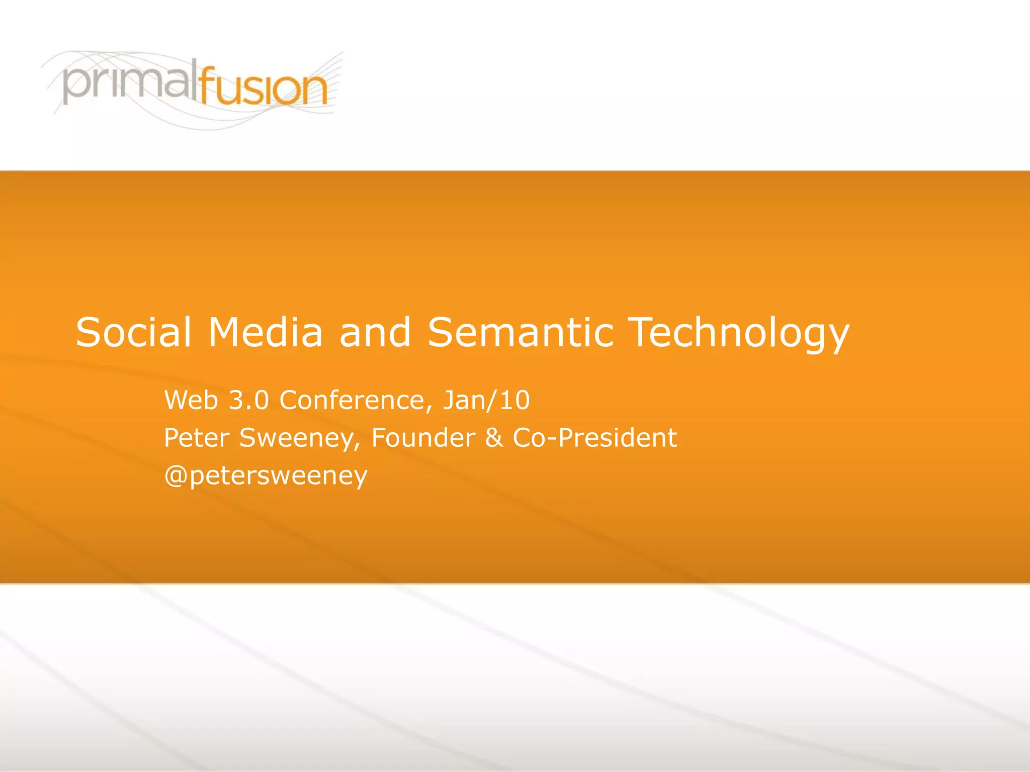 The document announces a Social Media and Semantic Technology Web 3.0 Conference to be held in January 2010. It will discuss challenges with social media, potential solutions using semantic technologies, and opportunities for applying semantic technologies to social media. The conference founder and co-president, Peter Sweeney, provides contact information should anyone want to learn more about the conference or ideas from PrimalFusion.com on using semantic networking approaches for social media.