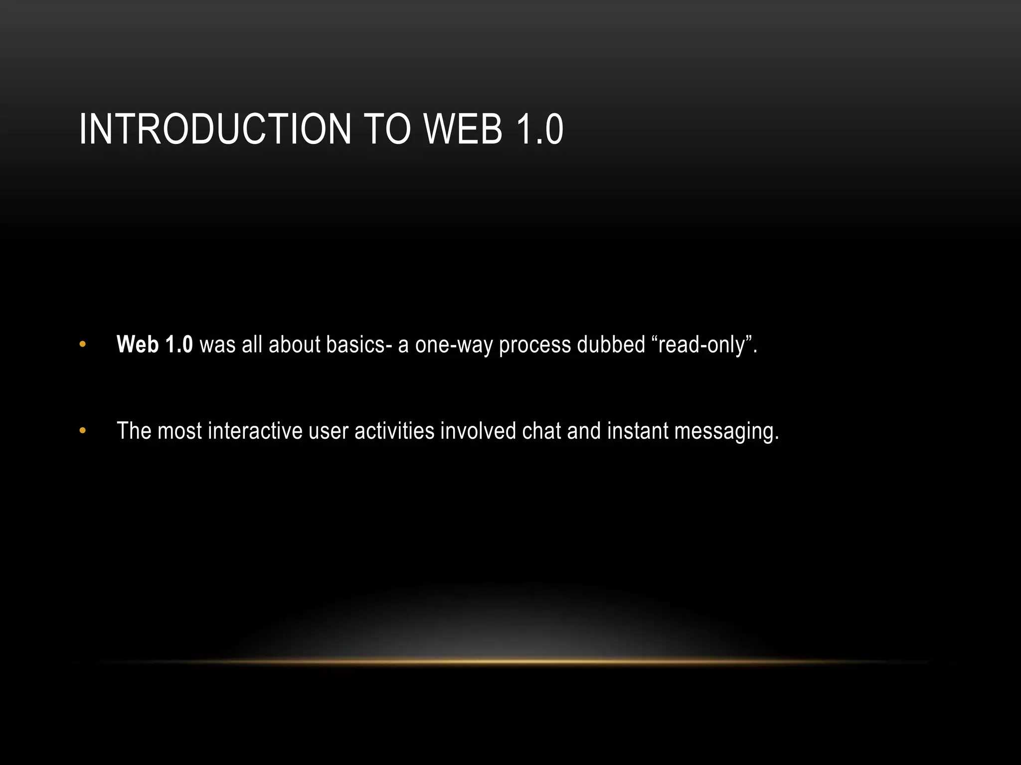 Web 1.0 allowed only one-way consumption of content while Web 2.0 enabled user-generated content through tools like blogs and social media. Web 3.0 will connect all this data through applications and widgets that are location-aware and personalized. It will understand semantics to provide intelligent, contextualized search and recommendations tailored to individual users through social profiles and activity on various connected devices and platforms. Commerce will also change as companies target niche audiences through new forms of advertising integrated with popular personalities and content.