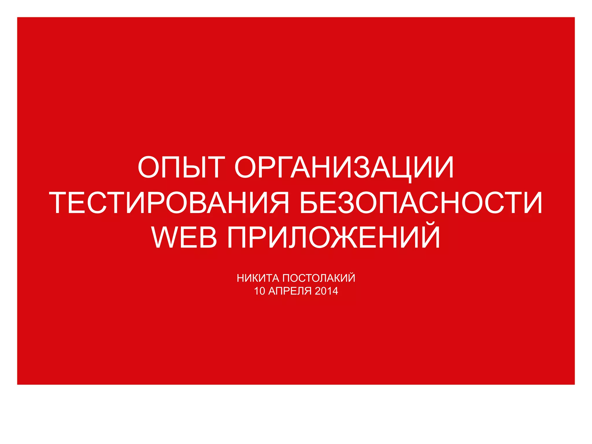 Документ описывает опыт Никиты Постолаки в организации тестирования безопасности веб-приложений, включая создание команды и процесс тестирования в срок 6 месяцев без привлечения внешних экспертов. Использование методологии OWASP для тестирования и рекомендации по обучению команды представляются основными аспектами работы. В тексте также перечислены ключевые этапы тестирования безопасности и методики оценки рисков.