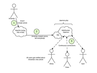 The document provides a comprehensive guide to using WebSockets with PHP, focusing on the Ratchet library for server setup and connection handling. It also discusses the integration of ZeroMQ for messaging between ordinary PHP scripts and the WebSocket daemon. Code examples illustrate how to create a WebSocket server, handle connections, and incorporate Ajax interactions.