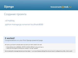 The document describes a blog application built with Django. It includes models for categories and posts with a many-to-one relationship. It defines views for listing posts, displaying individual posts and categories. Templates render the content and use template inheritance. Forms and email sending are implemented for contact. URLs are configured to map to the views. Tags extend template capabilities to include recent posts. The application uses Django components and patterns for building the blog functionality.