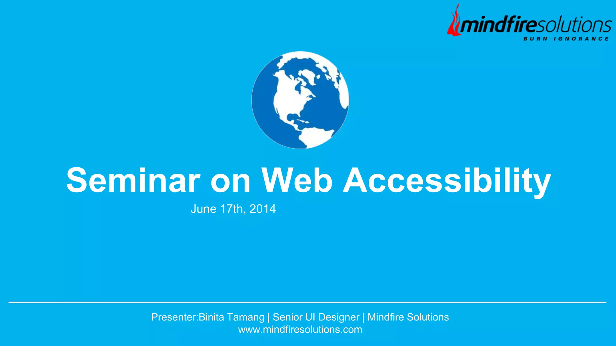 The seminar on web accessibility, presented by Binita Tamang, aims to raise awareness and empathy regarding the needs of users with disabilities in web design. Key topics include the definition of web accessibility, the importance of accessible design, relevant guidelines, common issues, and assistive technologies that enhance web usability for diverse users. The ultimate goal is to ensure that the web remains a valuable resource for everyone, enabling equal access and opportunities for all individuals.