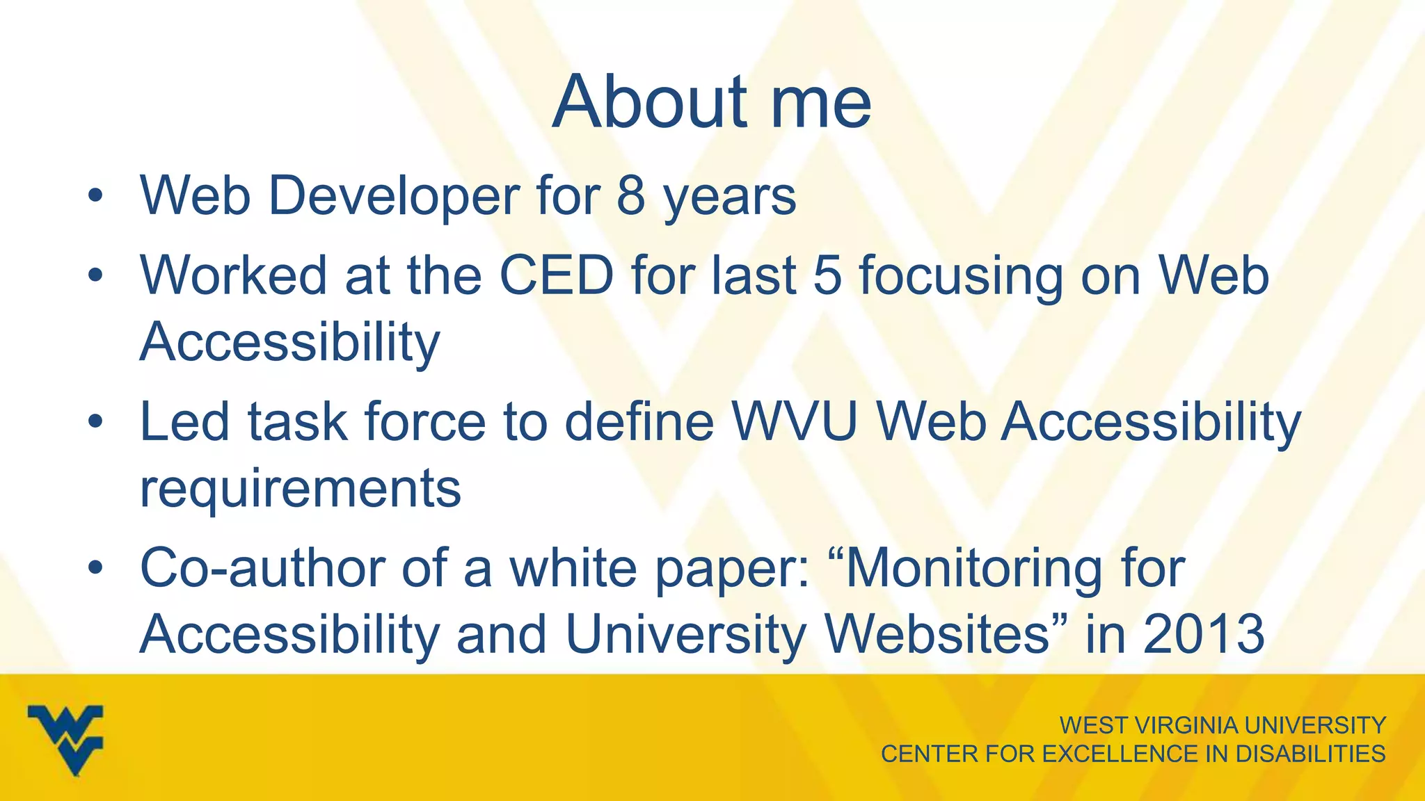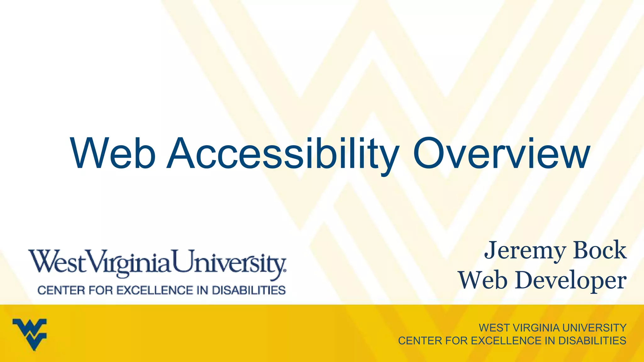This document provides an overview of web accessibility from a presentation given at West Virginia University. It defines web accessibility and why it is important, discusses considerations for various disabilities, and provides tools and resources for creating accessible content. The speaker aims to increase awareness of standards and best practices for developing websites that are usable by all people, including those with disabilities.