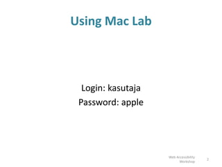 This document provides an overview of a web accessibility workshop held on March 3rd, 2016. The workshop covered several topics related to web accessibility including target user groups, empathy exercises using the web with limited abilities, frameworks for accessible web design, and preparing for WCAG 2.0 testing. The workshop was led by Vladimir Tomberg, PhD from Tallinn University. Participants were provided login credentials to use the Mac lab and instructions for completing in-class and home assignments. Today's workshop sessions included discussions of target user groups who benefit from accessible design, an empathy exercise using the web with limited abilities, an introduction to the principles of accessible web design, and an overview of WCAG 2.0 guidelines for web content accessibility testing