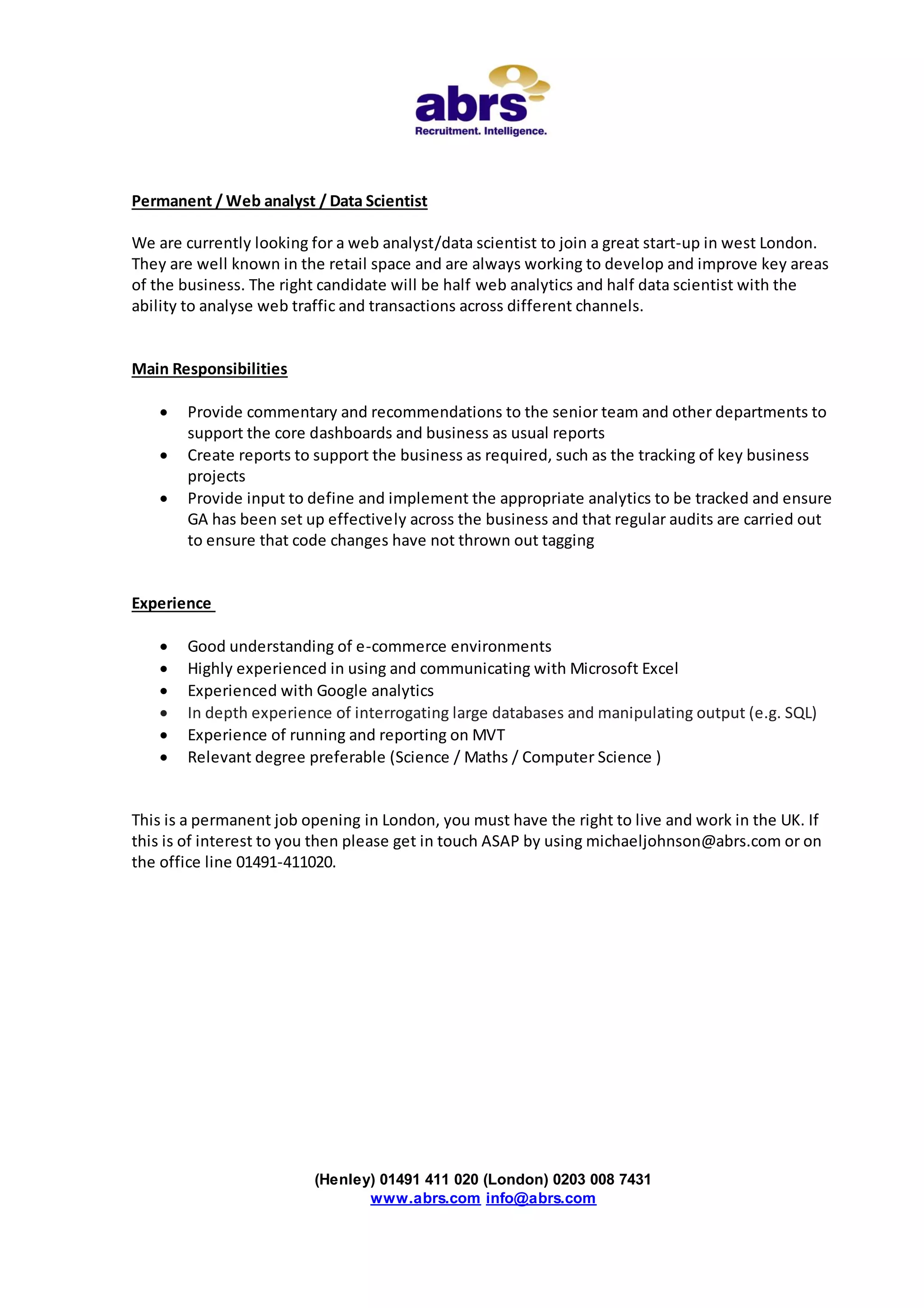 This job posting is seeking a permanent web analyst/data scientist to join a startup retail company based in west London. The ideal candidate will have experience with web analytics tools like Google Analytics, analyzing large databases using SQL, and A/B testing. Responsibilities include reporting on key business metrics and dashboards, creating custom reports, and ensuring analytics are set up correctly. Applicants should have experience in e-commerce, proficiency with Excel, and preferably a relevant degree. Interested and qualified candidates should contact the employer by email or phone.