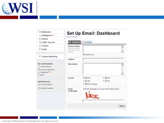 This document provides an overview of web analytics and how to analyze a website's performance. It discusses defining key performance indicators (KPIs) and customizing analytics reports for different site objectives like lead generation, content, support, and e-commerce. It also demonstrates how to generate reports in Google Analytics and use the analytics data to optimize aspects like paid search campaigns, exited pages, bounced pages, traffic sources, and converting keywords. Resources for further learning about web analytics are provided at the end.