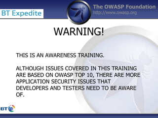 This document summarizes a presentation by Damilola Longe from the OWASP Foundation about web application defenses. It discusses the prevalence of applications in people's lives and security issues developers need to be aware of. It covers the OWASP Top 10 security risks like cross-site scripting and input validation. It provides examples of how to implement defenses against these risks using output encoding, sanitization libraries, and content security policy.