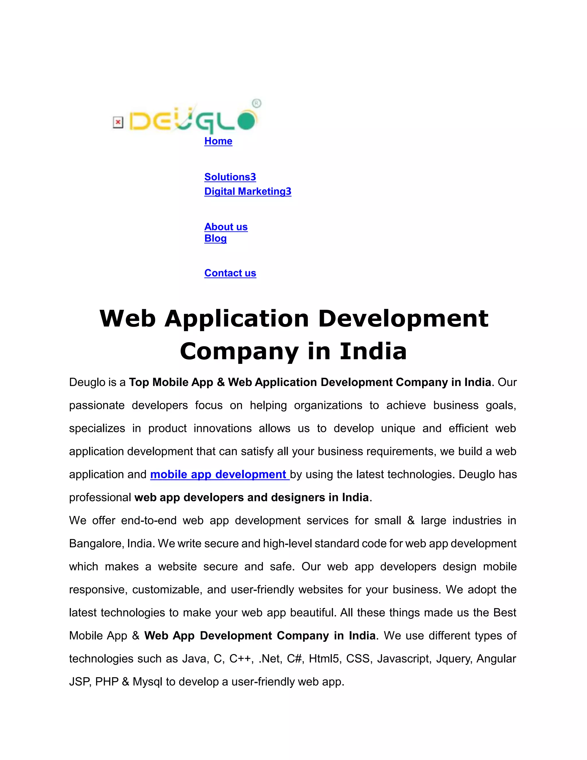 Deuglo is a leading web and mobile application development company based in India specializing in custom solutions for various industries. They utilize the latest technologies to create secure, user-friendly, and responsive applications, offering a comprehensive development process from analysis to deployment. Their mission is to provide top-notch services globally, ensuring that client needs are met with innovative and effective technology solutions.