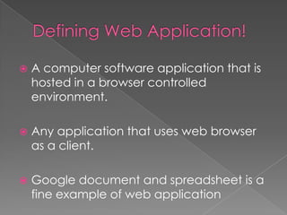The document outlines the web application development process, which includes five main phases: defining requirements, design, implementation, testing, and release. It details the specific steps within each phase, such as creating an application map, designing the database, and writing code in various languages. Examples of web applications like Google Docs and Farmville illustrate practical applications of these processes.
