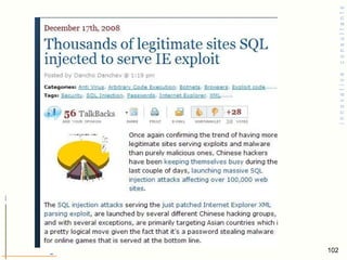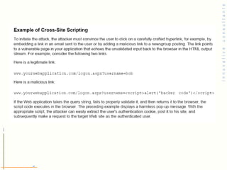 The document summarizes key points about web application security vulnerabilities and how to address them. It discusses common vulnerabilities like parameter manipulation, cross-site scripting, and SQL injection that occur due to improper validation of user input. It emphasizes the importance of validating all user input on the server-side to prevent attacks, and not storing sensitive values in cookies or hidden form fields that can be manipulated by attackers.