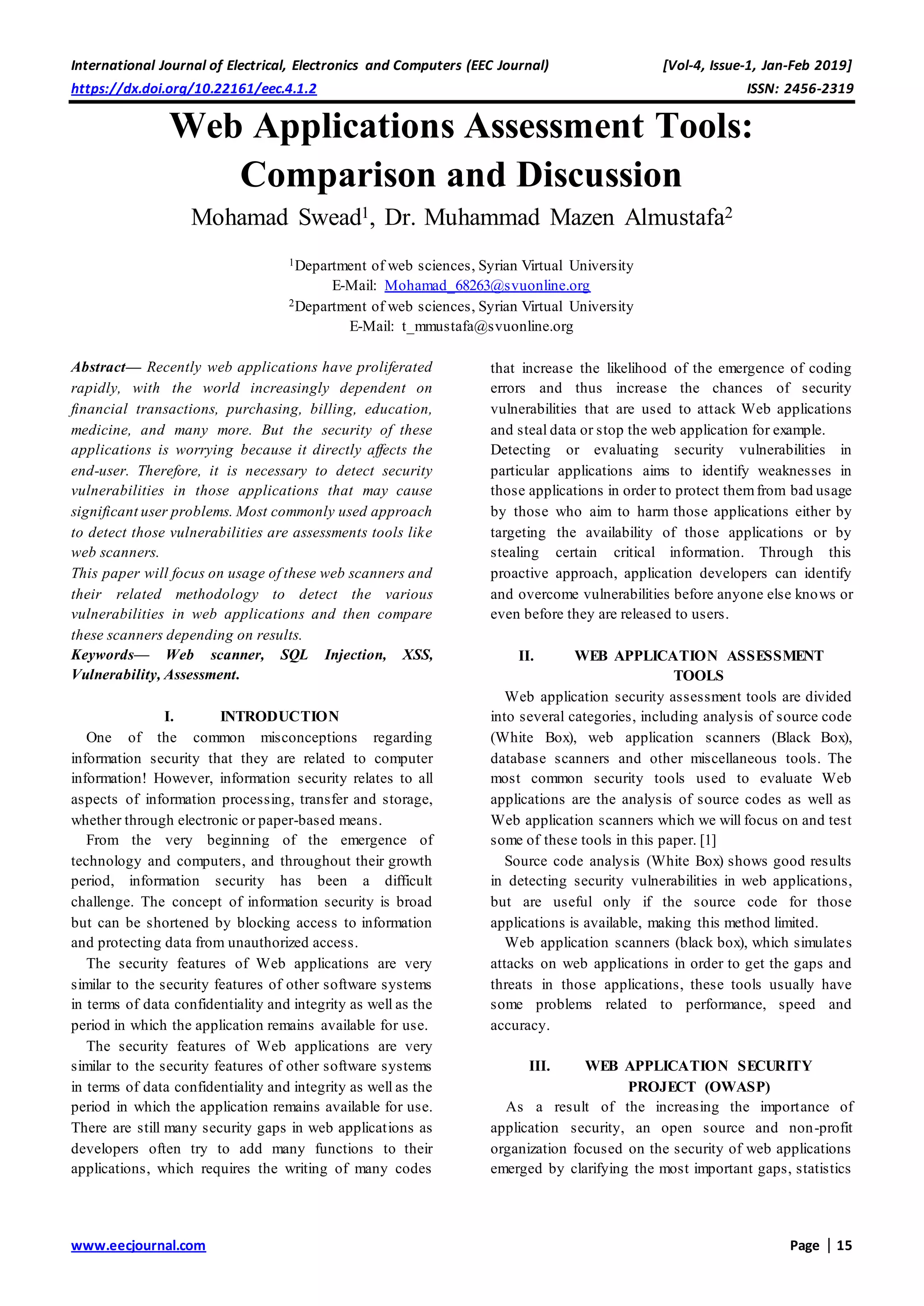 The document discusses the importance of security in web applications, highlighting how vulnerabilities can pose significant threats to end-users. It examines various assessment tools, particularly web application scanners, comparing their capabilities in detecting vulnerabilities like SQL injection and XSS. The paper emphasizes the need for robust vulnerability assessment techniques to enhance web application security in various sectors.