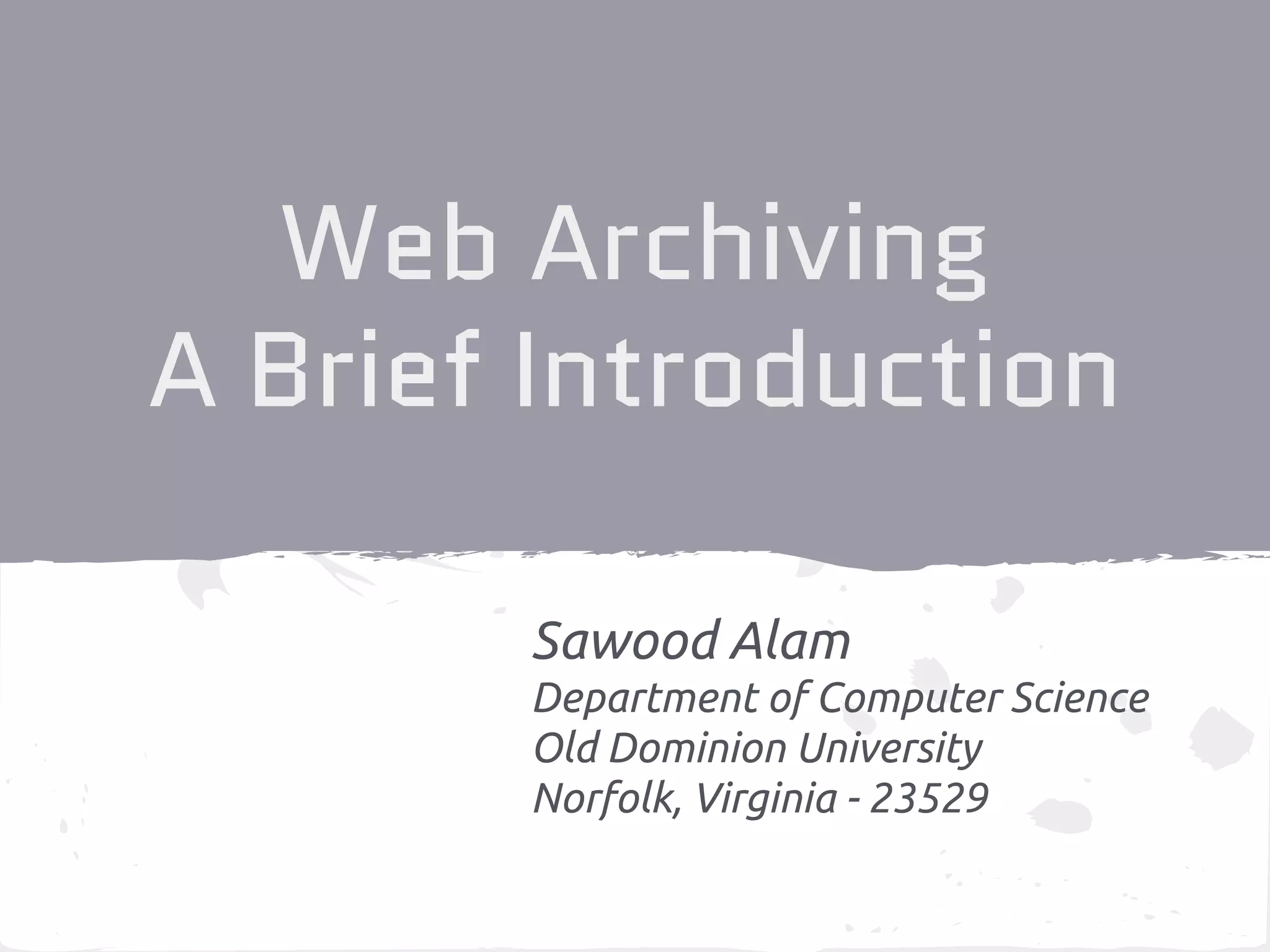 The document is an introduction to web archiving by Sawood Alam from Old Dominion University, covering what archives and web archiving are, their significance, and the associated challenges. It discusses various efforts and tools for web archiving, his research focus on 'archive x-ray,' and potential research opportunities in the field. Additionally, it offers guidance for studying abroad in higher education.