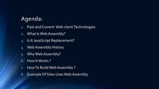 Web Assembly is a new web standard that defines a binary format for executable code in web pages. It is meant to enable executing code nearly as quickly as native machine code. Web Assembly allows other languages like C/C++ to be compiled to run in the browser. It has performance gains over JavaScript due to execution speed and smaller file sizes. Major browsers now support Web Assembly, allowing its use without plugins. Common use cases include games, media editing, peer-to-peer apps, and scientific/CAD applications.