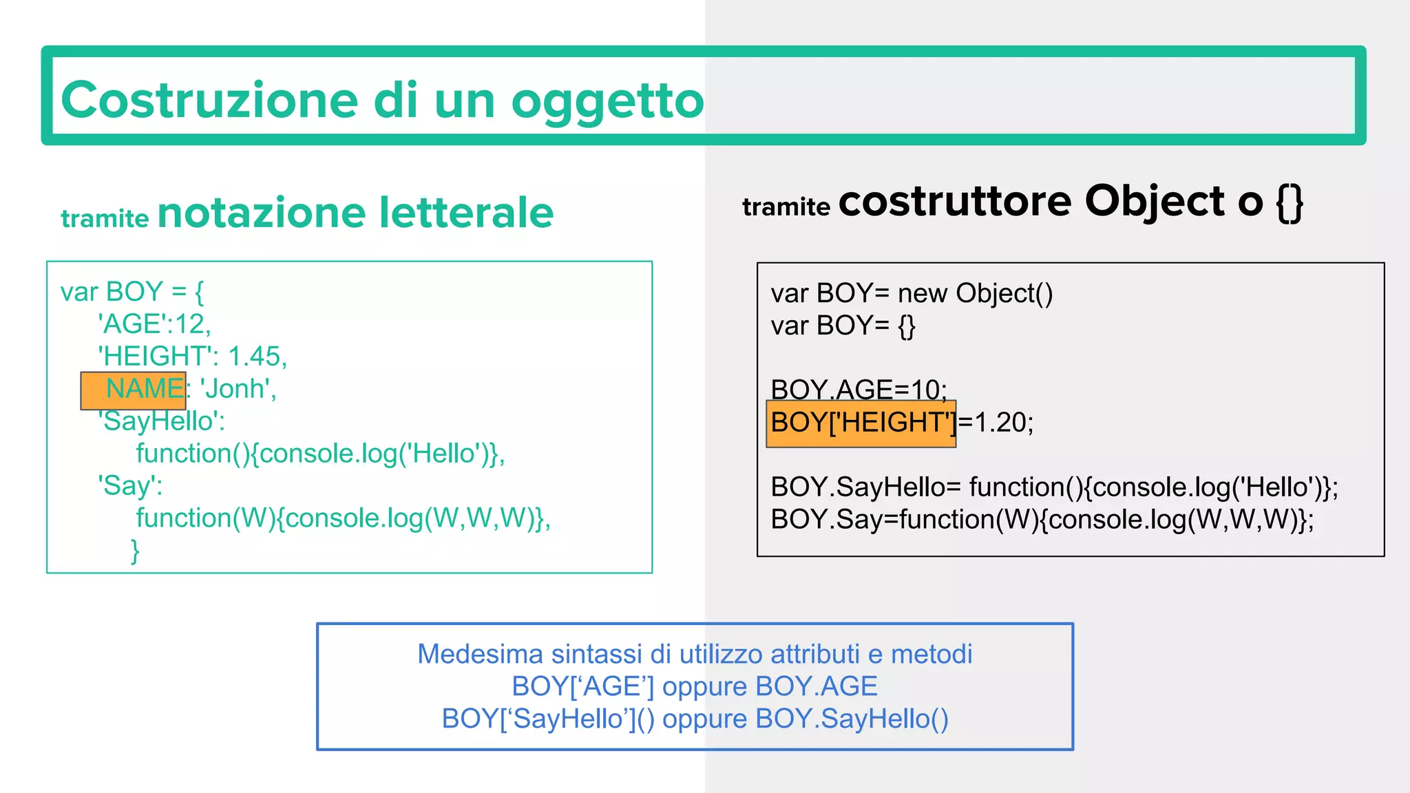 Il documento tratta la costruzione e l'utilizzo di oggetti in JavaScript, illustrando diverse tecniche come la notazione letterale e l'utilizzo di funzioni costruttrici. Viene spiegato come definire attributi e metodi e si fa un confronto tra JavaScript e Python in merito alla creazione di oggetti. Include anche esempi pratici di oggetti e metodi, nonché dettagli sui prototipi.