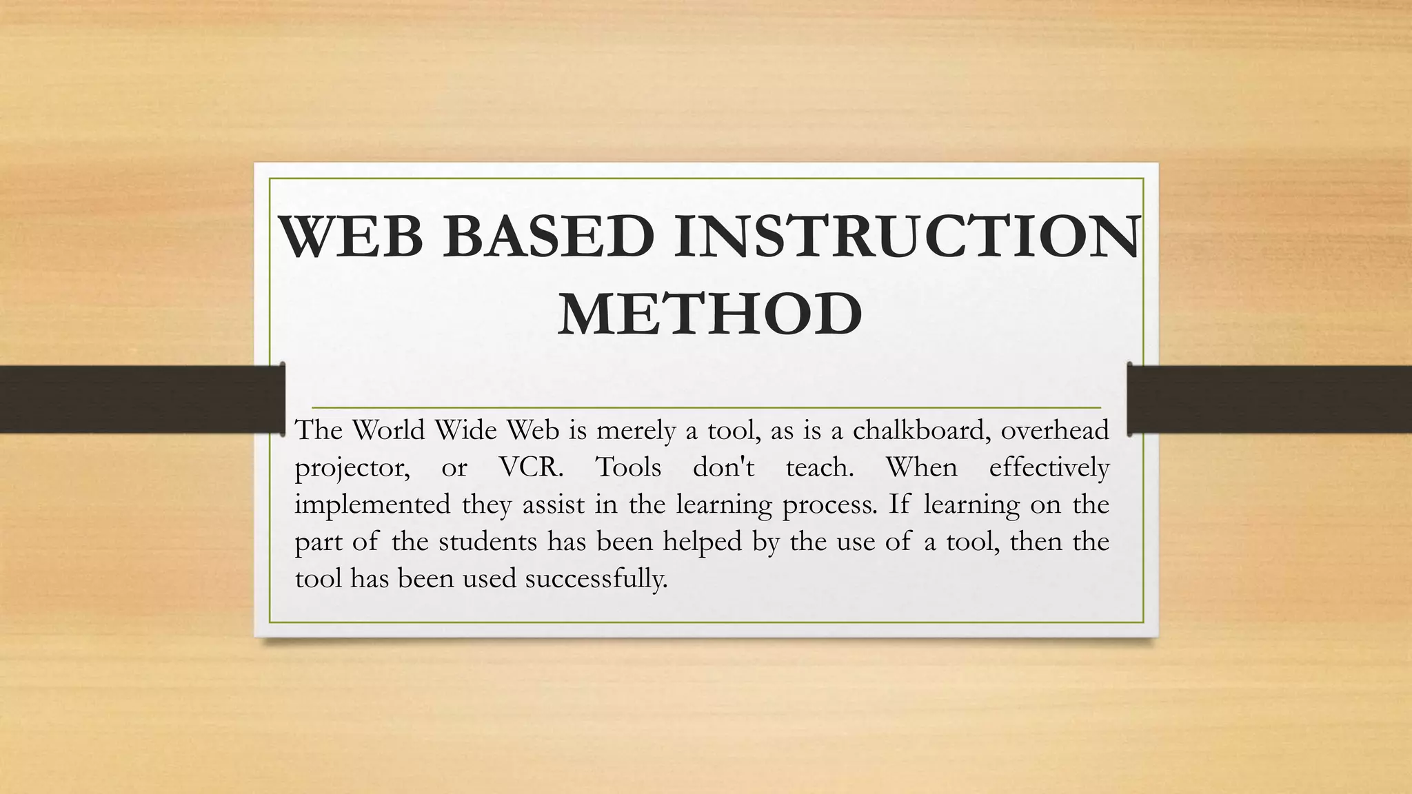 The document discusses the web-based instruction method, which utilizes the internet as a learning tool that enhances student learning through various digital platforms and resources. It emphasizes the teacher's role as a guide and outlines the advantages and disadvantages of this method, including improved instructional materials and potential distractions for students. Key supporters of this approach include Dr. Norman Mathew and Dr. Maryanne Doherty-Poirier, both of whom are affiliated with educational institutions in Alberta, Canada.