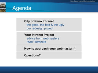 The document presents an overview of web-based internal communications strategies discussed at the 3CMA conference by Kristy Fifelski from the City of Reno, Nevada. It covers the redesign of the city intranet, highlighting effective communication tools, collaboration features, and advice for engaging with webmasters from various municipalities. The session emphasized the importance of employee involvement and feedback in creating a user-friendly intranet experience.