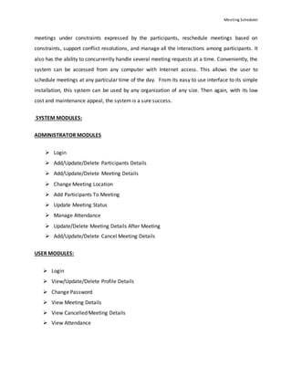 This document describes the development of a web-based meeting scheduler system. The system allows users to call meetings, send details to invitees, and supports scheduling meetings by determining dates, locations and managing conflicts. It has modules for administrators to manage participants, meetings and attendance, and for users to view/update profiles, meetings and attendance. The system is developed using Java/J2EE on the front-end and MySQL on the back-end.