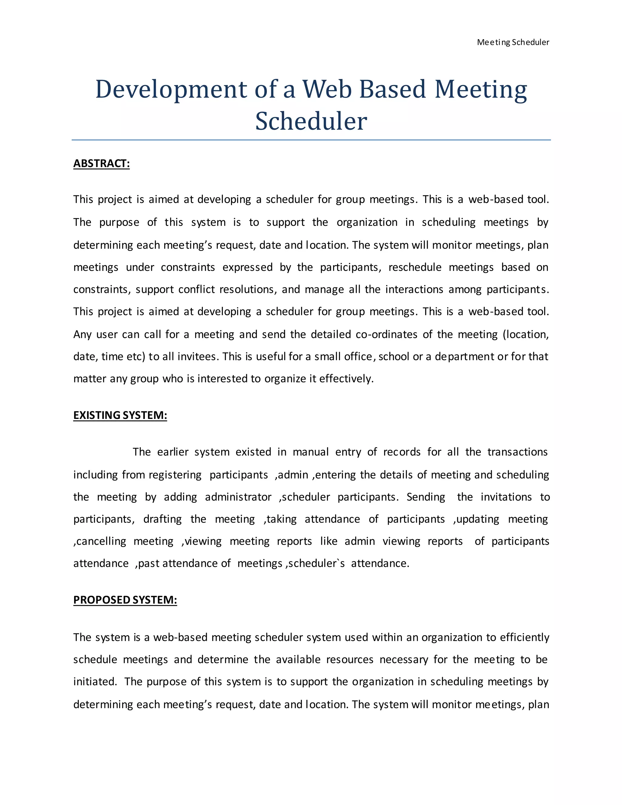 This document describes the development of a web-based meeting scheduler system. The system allows users to call meetings, send details to invitees, and supports scheduling meetings by determining dates, locations and managing conflicts. It has modules for administrators to manage participants, meetings and attendance, and for users to view/update profiles, meetings and attendance. The system is developed using Java/J2EE on the front-end and MySQL on the back-end.