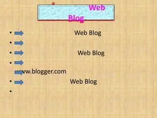 ความเป็นมาของWeb BlogWeb Blog คือ Blog มาจากศัพท์คำว่าWeBlog บางคนอ่านคำ ๆ นี้ว่าWeblog บางคนอ่านว่า Web Blog แต่ทั้งนี้ทั้งนั้น ทั้งสองคำบ่งบอกถึงความหมายเดียวกัน ว่านั่นคือบล็อก (Blog) ถูกใช้งานเป็นครั้งแรกโดย Jorn Barger ในเดือนธันวาคม ปี 1997ความหมายของคำว่า Blog คือการบันทึกบทความของตนเอง (Personal Journal) ลงบนเว็บไซต์ โดยเนื้อหาของ blog นั้นจะครอบคลุมได้ทุกเรื่อง ไม่ว่าจะเป็นเรื่องราวส่วนตัว หรือเป็นบทความเฉพาะด้านต่าง ๆ เช่น เรื่องการเมือง เรื่องกล้องถ่ายรูป เรื่องกีฬา เรื่องธุรกิจ เป็นต้น - 4.