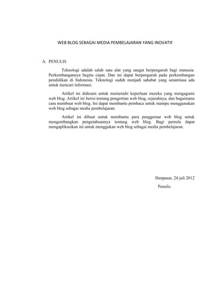 Web blog merupakan media pembelajaran inovatif yang semakin populer di kalangan siswa. Mereka menggunakan web blog untuk mencari berbagai informasi yang dibutuhkan dalam pembelajaran secara praktis. Web blog dapat diakses melalui internet dan menyediakan beragam konten seperti artikel, video, yang dapat meningkatkan minat belajar siswa.