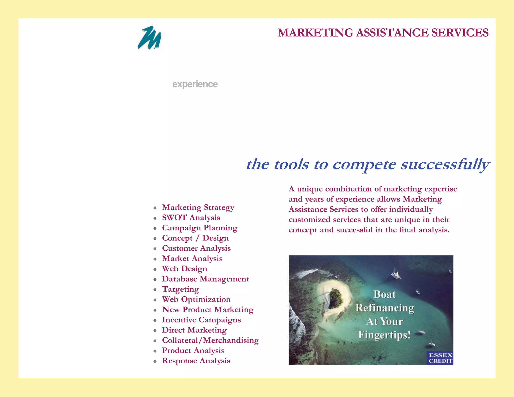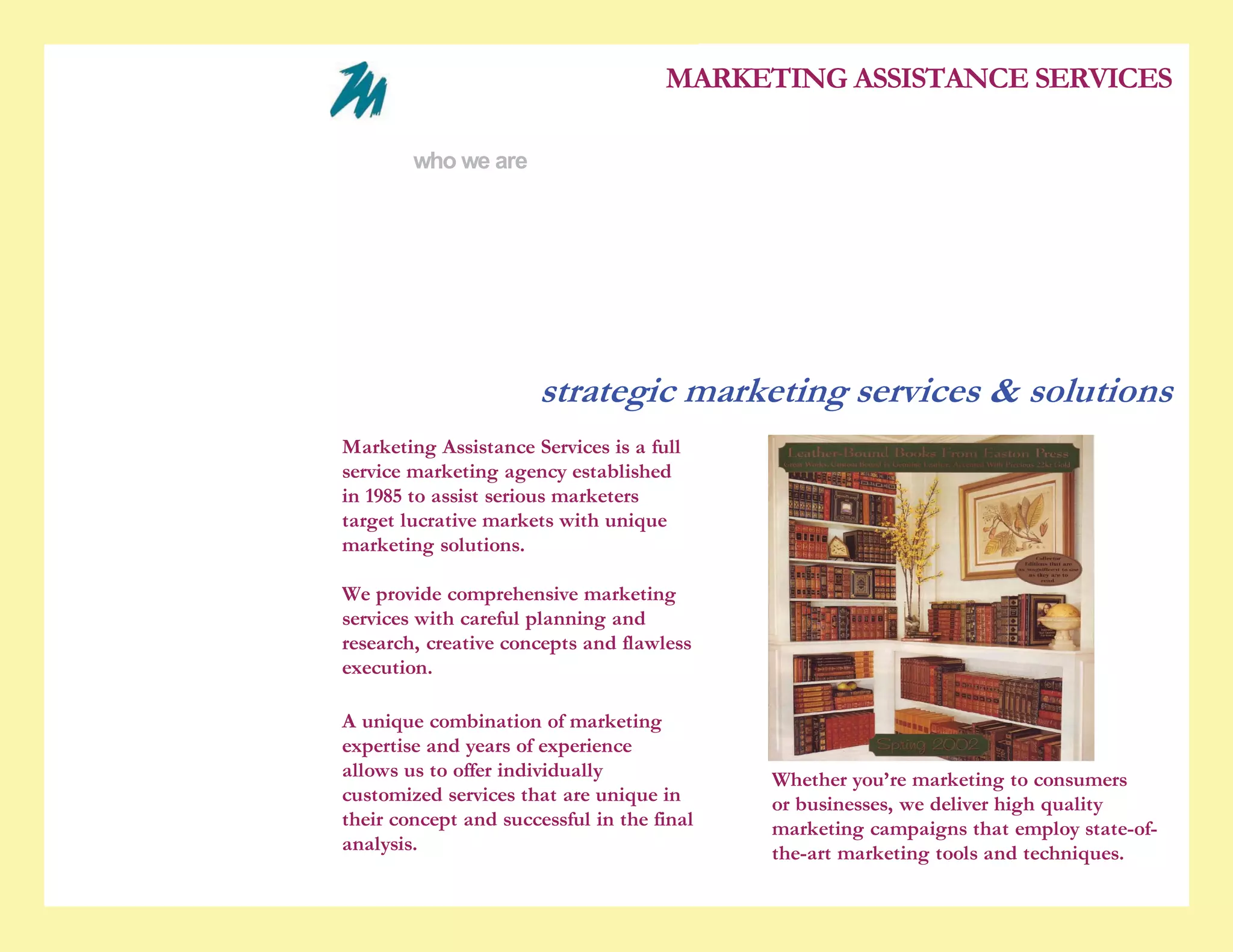 Marketing Assistance Services is a full-service marketing agency established in 1985 that provides comprehensive marketing services including strategic planning, creative design, web design, and target marketing. They offer individually customized marketing solutions tailored to each client's unique needs across various industries such as banking, insurance, retail, and education. Their extensive experience and tailored approach helps clients efficiently achieve their marketing goals and compete successfully in their markets.