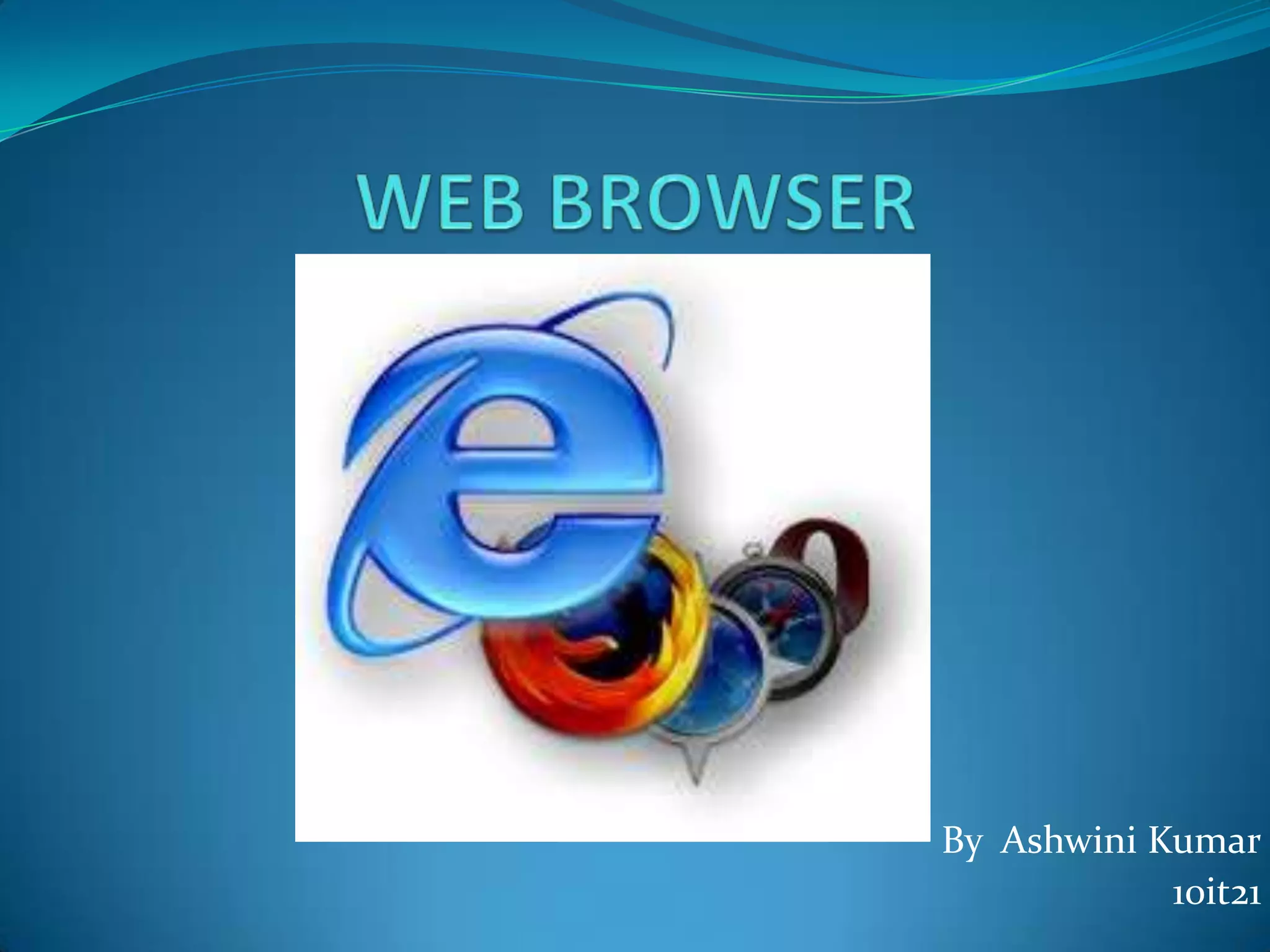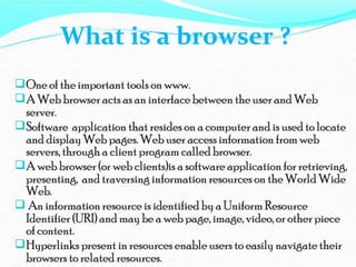 The document discusses the history and components of web browsers. It describes how the first web browser was invented by Tim Berners-Lee in 1990 and how other major browsers like Internet Explorer, Opera, Firefox, and Safari were subsequently developed. It explains that the main functionality of browsers is to request and display web pages through components like the rendering engine, user interface, networking, and JavaScript interpreter. The rendering engine is responsible for parsing HTML, applying styles, building frames, and painting the displayed content.