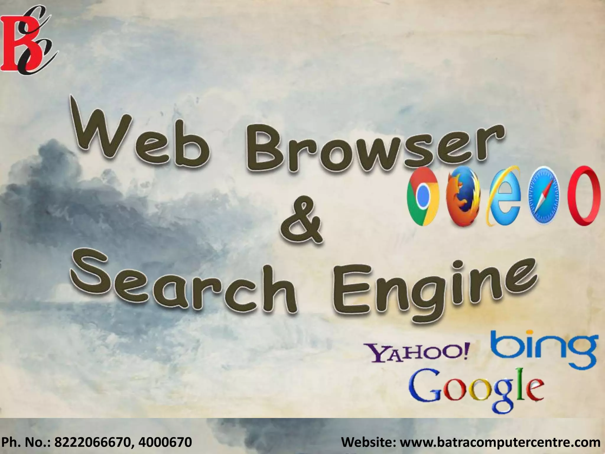 The document provides an overview of web browsers, highlighting their role in accessing information on the internet and detailing features of popular browsers like Chrome, Firefox, Internet Explorer, and Safari, particularly their developer tools. It also explains search engines, discussing how they work, their unique algorithms, and providing examples such as Google, Yahoo!, and Bing. Additionally, contact information for Batra Computer Centre is included throughout the text.