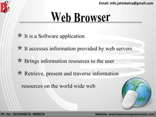 The document provides an overview of various web browsers, including details about their developers, programming languages, engines, and features such as private browsing and speed enhancements. It mentions specific browsers like Google Chrome, Mozilla Firefox, Opera, Internet Explorer, and Safari, highlighting their unique capabilities and overall performance. Additionally, the document includes contact information for Batra Computer Centre, where more information may be available.