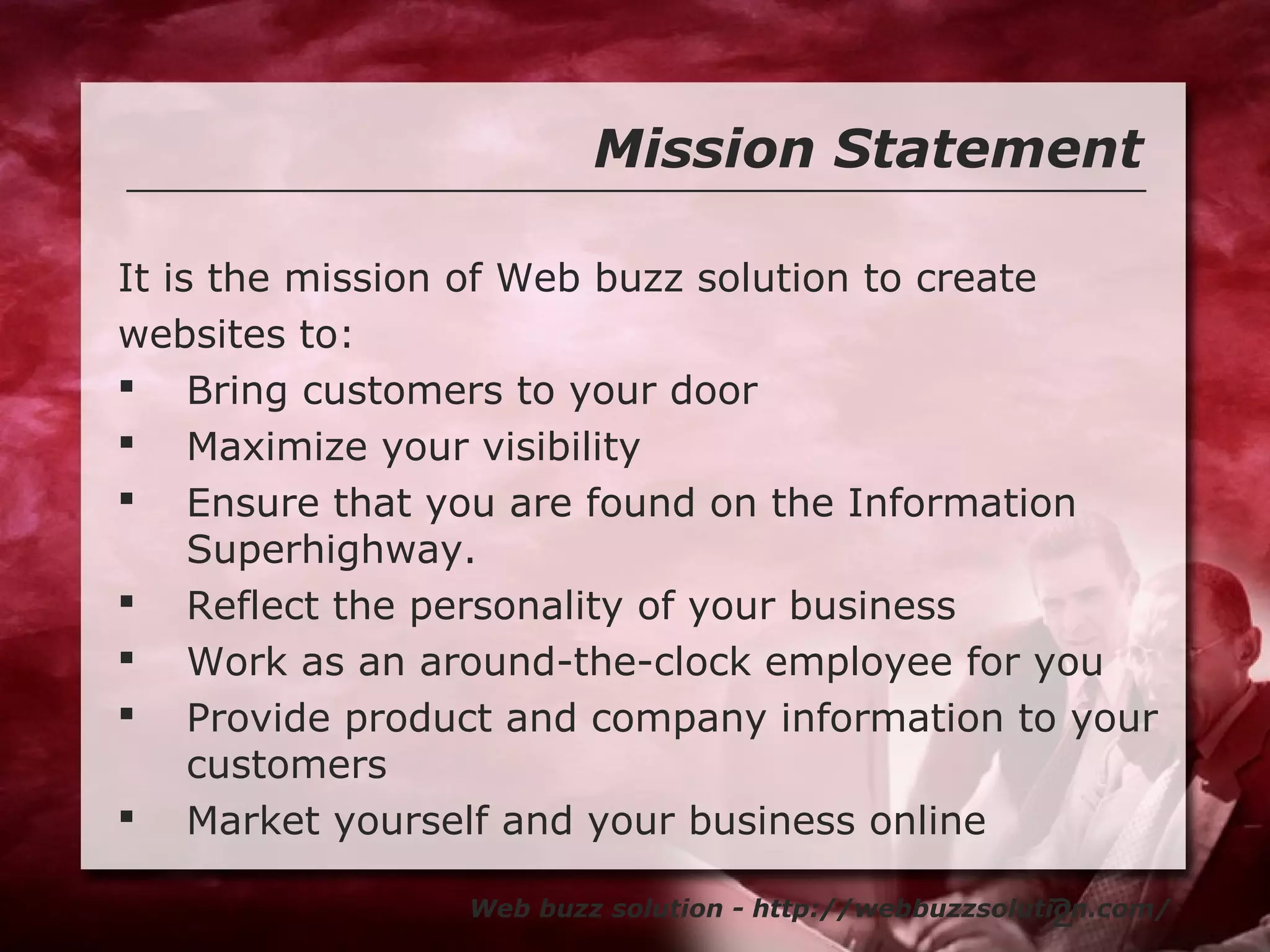 Web Buzz Solution is a web design and development company focused on creating customized websites that enhance visibility and reflect business personality. They offer a variety of services including e-commerce solutions, SEO, and website maintenance, emphasizing quality and integrity. The company is dedicated to using the latest technology and trends to provide effective online solutions for their clients.