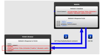 The document discusses cache JSON hijacking and cross-site request forgery (CSRF). It provides examples of how an attacker could steal JSON data from a cache by overriding native JavaScript methods and injecting scripts to access APIs without authorization.